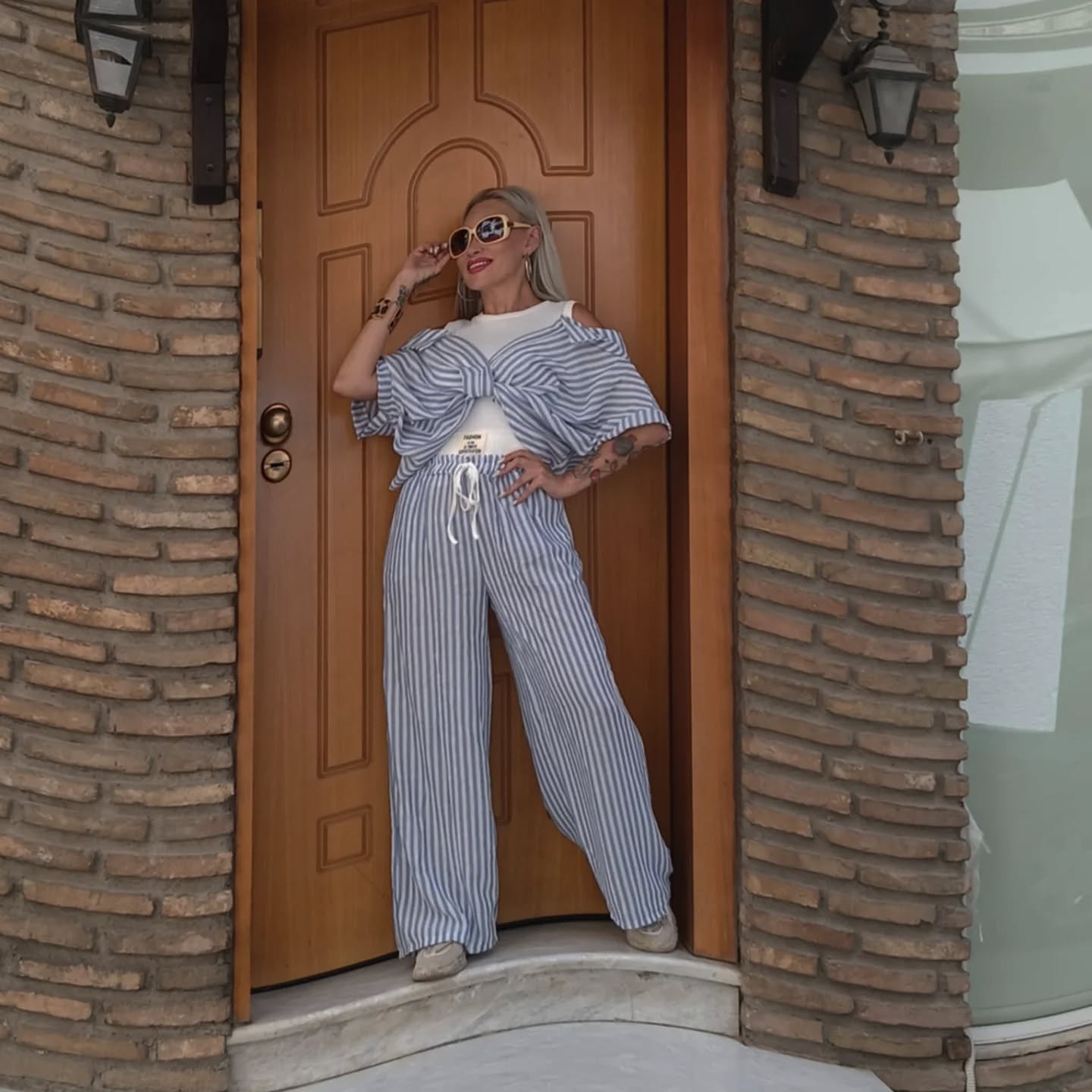 Ανακάλυψε την άνεση και το στυλ του “Nautical Breeze” σετ. Η έξωμη μπλούζα και η φαρδιά παντελόνα δημιουργούν το απόλυτο effortless look, είτε για την πόλη είτε για τις διακοπές σου. Το ριγέ μοτίβο προσθέτει μια ναυτική πινελιά που ταιριάζει τέλεια σε καλοκαιρινές εμφανίσεις.