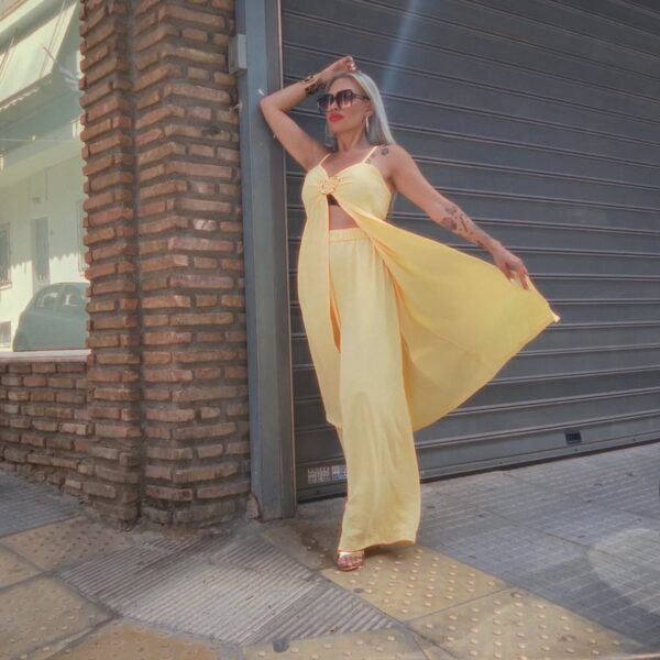 Δώσε λάμψη στις καλοκαιρινές σου εμφανίσεις με αυτό το εντυπωσιακό κίτρινο σετ! Το crop top με τον ιδιαίτερο κόμπο στο στήθος και το αέρινο άνοιγμα συνδυάζεται άψογα με τη φαρδιά ψηλόμεση παντελόνα, δημιουργώντας μια σιλουέτα που εκπέμπει φρεσκάδα και θηλυκότητα. Ιδανικό για πρωινές βόλτες στην πόλη, απογευματινά events ή νησιώτικες αποδράσεις.